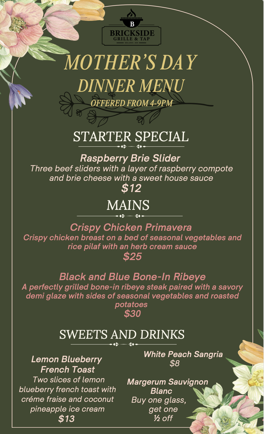 Celebrate Mom at Brickside Grille and Tap! Join us for a delicious Brunch Buffet or indulgent Dinner from our signature menu and special offerings.