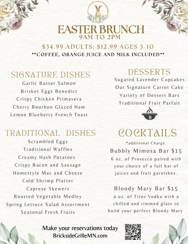 Reserve your table for Easter Brunch at Brickside Grille and Tap! Enjoy a festive, family-friendly menu of springtime favorites. $34.99 for Adults, $12.99 Children ages 3-10.